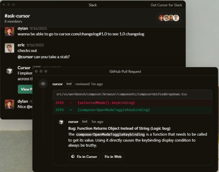 Cursor is in GitHub reviewing your PRs, a teammate in Slack, and anywhere else you work.